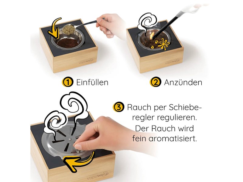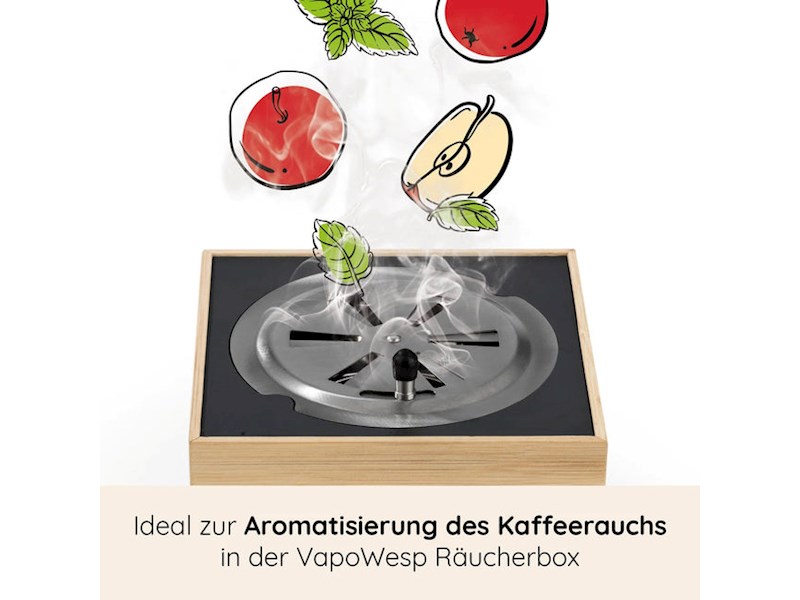Diese Kräutermischung ist speziell für die Anwendung mit deiner VapoWesp Räucherbox* hergestellt worden. Einfach das VapoPulver mit gemahlenem Kaffee (nicht im Lieferumfang enthalten) in die Schale der Räucherbox geben und an mehreren Stellen anzünden, bis die Mischung anfängt zu glimmen. Durch die speziellen, natürlich duftenden VapoWesp Kräutermischungen wird das glimmende Kaffeepulver, welches normalerweise nach einiger Zeit unangenehm riecht, angenehm aromatisiert.
