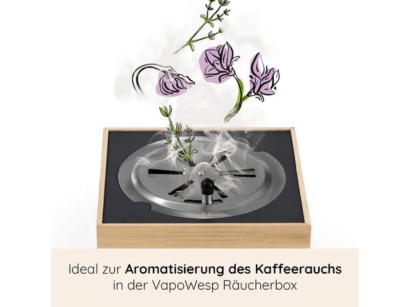 Diese Kräutermischung ist speziell für die Anwendung mit deiner VapoWesp Räucherbox* hergestellt worden. Einfach das VapoPulver mit gemahlenem Kaffee (nicht im Lieferumfang enthalten) in die Schale der Räucherbox geben und an mehreren Stellen anzünden, bis die Mischung anfängt zu glimmen. Durch die speziellen, natürlich duftenden VapoWesp Kräutermischungen wird das glimmende Kaffeepulver, welches normalerweise nach einiger Zeit unangenehm riecht, angenehm aromatisiert.